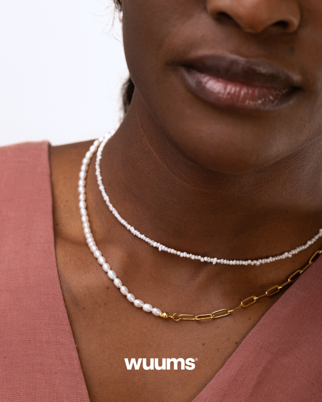 Perlový náhrdelník je zdobený strieborným, 18k pozláteným krúžkom...