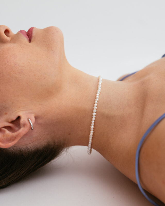 Perlový náhrdelník je zdobený strieborným, 18k pozláteným krúžkom...