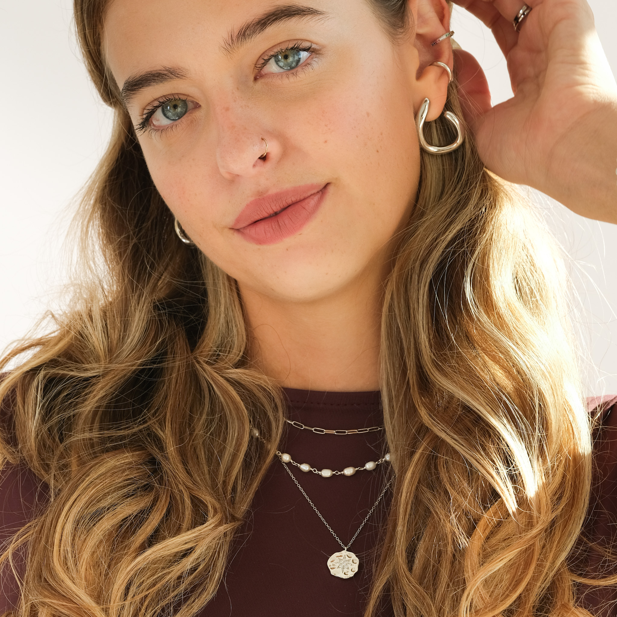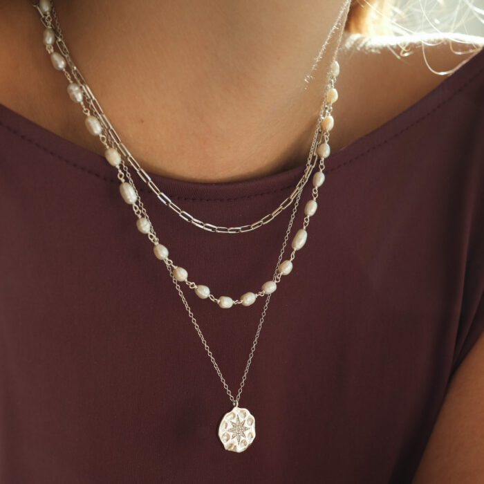Náhrdelník IVORY je vyrobený z rhodiovaného 925 striebra v kombinácií s riečnymi perlami. Je to krásny, kombinovaný kúsok, ktorý dodá na výnimočnosti každému outfitu. Upozorňujeme, že perličky nemusia byť dokonale pravidelného tvaru a vzájomne rovnaké, nakoľko ide o prírodný produkt a každá perla je jedinečná.