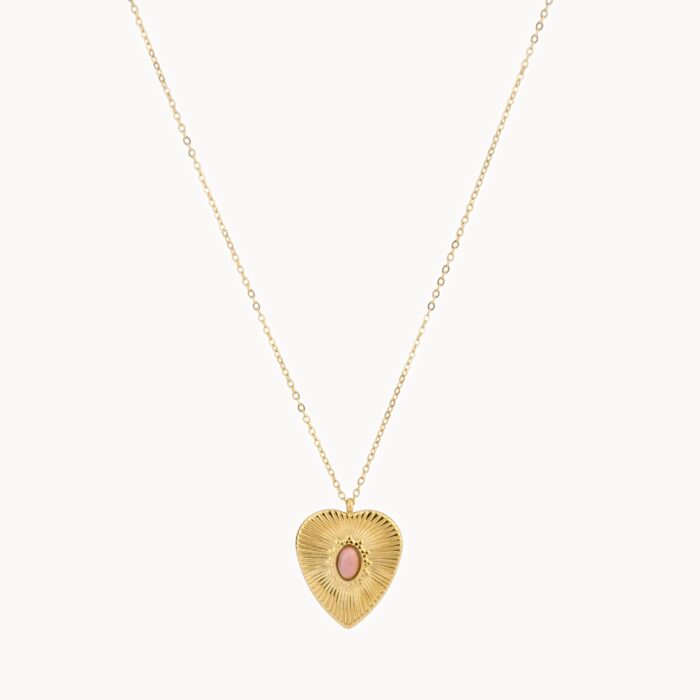 Náhrdelník ROSALIE zlatej farby, vyrobený z chirurgickej, nehrdzavejúcej ocele, pozlátený 14k zlatom je doplnený o medajlón v tvare srdca s ružovým kameňom uprostred. Krásne vyplní váš dekolt a doladí celý váš outfit. Náhrdelník ROSALIE je navyše z našej kolekcie vodeodolných šperkov, vďaka čomu je odolnejší voči vonkajším vplyvom, nepodlieha ľahko korózií ani oxidácií a vy sa tak s ním môžete aj sprchovať či kúpať v sladkej vode, bez toho aby ste sa museli báť, že sa vám poškodí. Viac o rozdieloch medzi striebornými šperkami a šperkami vyrobenými z chirurgickej ocele v našom online magazíne.