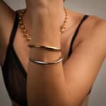 Perlový náhrdelník je zdobený strieborným, 18k pozláteným krúžkom...