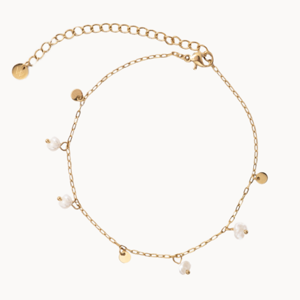 Náramok na nohu SUNNY. je vyrobený z hypoalergénnej, chirurgickej ocele, pozlátený 14k zlatom. Tvorený je retiazkou doplnenou o prívesky z riečnych perál a pozlátené kruhové pliešky. Je to jemný, no zároveň krásny detail, ktorý dokonale doladí každý letný outfit. Patrí do našej kolekcie „Vodeodolných šperkov“, čo znamená, že ho môžete bez obáv nosiť každý deň, môžete sa s ním kúpať, sprchovať či vykonávať vašu obľúbenú aktivitu bez toho aby ste ho museli dávať dole. Stačí si ho dať na nohu na začiatku leta – a nemusíte ho dávať dole až do jeho konca. Zostane krásny, žiarivý a stále rovnako štýlový.