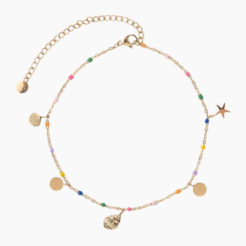 Náramok na nohu SUNNY. je vyrobený z hypoalergénnej, chirurgickej ocele, pozlátený 14k zlatom. Tvorený je retiazkou doplnenou o prívesky z riečnych perál a pozlátené kruhové pliešky. Je to jemný, no zároveň krásny detail, ktorý dokonale doladí každý letný outfit. Patrí do našej kolekcie „Vodeodolných šperkov“, čo znamená, že ho môžete bez obáv nosiť každý deň, môžete sa s ním kúpať, sprchovať či vykonávať vašu obľúbenú aktivitu bez toho aby ste ho museli dávať dole. Stačí si ho dať na nohu na začiatku leta – a nemusíte ho dávať dole až do jeho konca. Zostane krásny, žiarivý a stále rovnako štýlový.