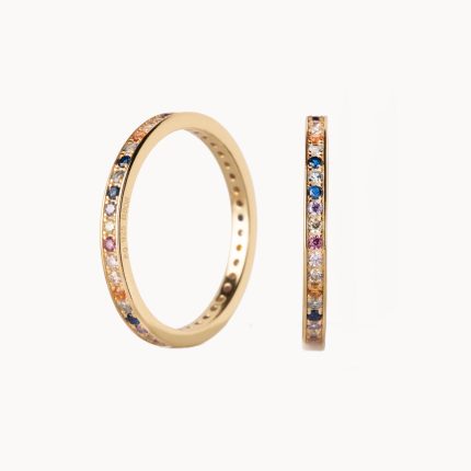 Strieborný prsteň ETERNITY RAINBOW s 18k pozlátením je po celom svojom obvode zdobený farebnými zirkónmi. Na dennom či umelom svetle hrá tento prsteň farebnými odtieňmi, ktoré sa na ruke nádherne lesknú. Ak chcete svoj outfit ešte viac zvýrazniť, odporúčame umiestniť dva ETERNITY RAINBOW prstene za sebou na jeden prst, či už v zlatej alebo striebornej kombinácií. Všetky prstene ETERNITY RAINBOW sú v skutočnosti o číslo menšie ako je uvedené (veľkosť 50 je v skutočnosti 49 a pod.).